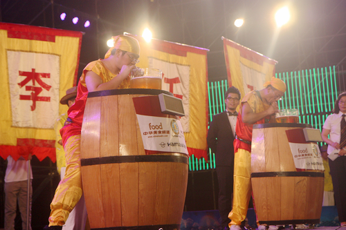 在第一項(xiàng)“吹的響亮”中,眾多選手一改預(yù)賽、復(fù)賽時(shí)保守的喝法,各自拿出了看家本領(lǐng),前三位選手全部“哈”進(jìn)了6秒的大關(guān),任光超更是喝出了4.83秒的個(gè)人本年最好成績(jī)!之前最大的吹瓶賽最大的“黑馬”賈羅秋喝出了驚人的4.29秒,但遺憾的由于剩酒過多失去了摘冠的機(jī)會(huì),該單項(xiàng)第一名由任光超獲得。