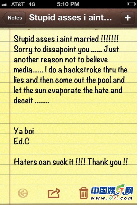 中國娛樂網訊:北京時間8月28日8點10分左右,陳冠希在微博首次回應與王思喬隱婚事件,因中文不好,陳冠希用英文發表博文,并希望網友幫助翻譯,在博文中,陳冠希態度堅決否認自己已經結婚,從他激烈的言辭中,可以看出陳冠希對自己隱婚的新聞十分反感,在文中他說:“對不起,令你失望了”,不知是否是暗指王思喬在借自己炒作。