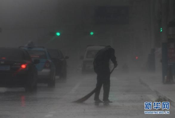 8月28日,山東威海一名環衛工人在暴風雨中清理路面垃圾,防止路面防洪口堵塞。當日,受今年第15號臺風“布拉萬”影響,山東沿海地區迎來大風暴雨天氣,海邊掀起巨浪。
