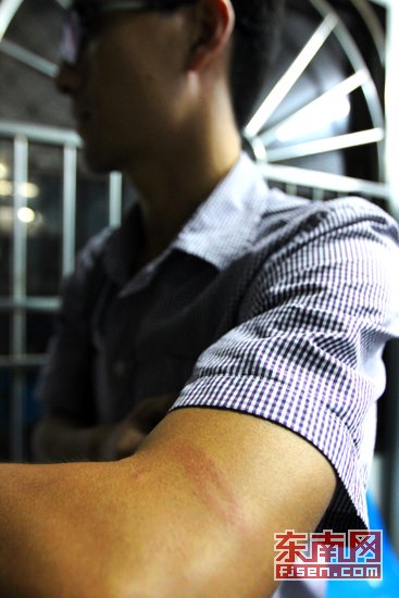 張先生的手臂和頭部都被擊打到,頭部腫了個包,手臂傷口紅腫。