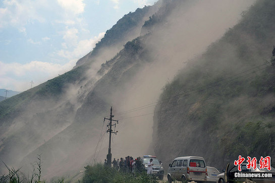 9月8日,云南彝良地震震中洛澤河鎮附近道路上,不斷發生的余震引發山體落石。截止8日早上8時,云南彝良地震災區發生余震161次,最大余震4.4級。圖為余震引發山體落石,揚起大量灰塵。