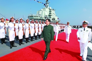 儀式結(jié)束后,胡錦濤健步登上“遼寧艦”,檢閱了海軍儀仗隊(duì)。