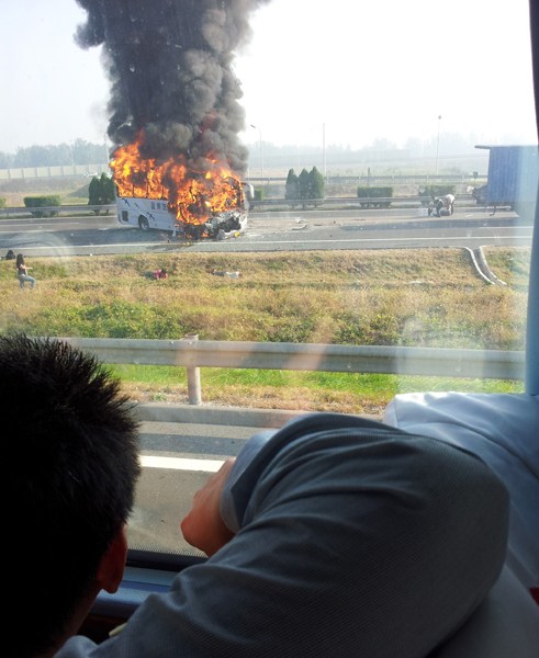 10月1日早8時許,G2京滬高速公路天津武清段一輛大客車追尾著火。圖片來自:@笑話大王彭彭