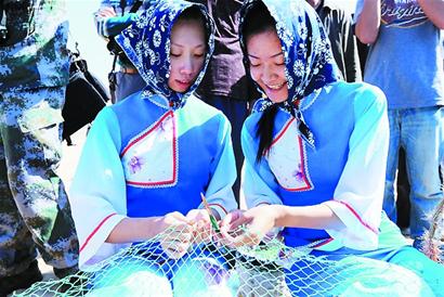 ????昨天上午,在靈山漁村,一場漁家婚禮的表演正在舉行。漁家姑娘裝扮成新娘,被轎夫們用花轎抬到新郎家。在新郎家的庭院中,擺著香案,新郎新娘拜天地,父母高堂然后送入洞房。村東外的海邊,八位漁家打扮的姑娘在縫補漁網(wǎng)。村子的西側(cè),一對漁民夫妻正忙著把出海打回來的魚晾曬制成魚干。