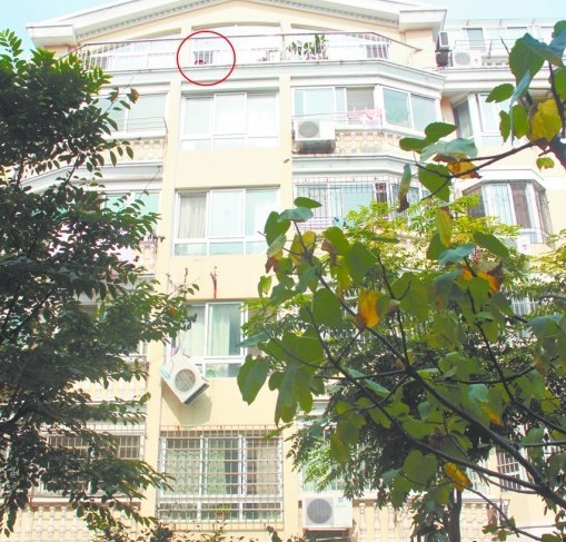 老人從六樓陽臺(紅圈處)墜亡,砸斷了三樓的空調室外機。
