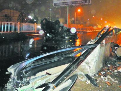 ????“當時路上也沒有多少車,這輛轎車車速很快從北邊橋上開過來,徑直撞在馬路中間的隔離墩上,發出很大的一聲悶響?!庇浾呗動嵹s到現場時,圍觀的目擊者稱。記者看到一輛紫色轎車四輪朝天倒扣在馬路中間,右側車頭撞損嚴重,右側車門不翼而飛,右前輪也不見了蹤影,前擋風玻璃完全破碎,車邊