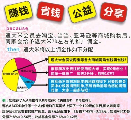 ??? 3、在中國公益缺乏公信力的社會環(huán)境下,返大米網(wǎng)獨家推出了返大米網(wǎng)購公益基金,讓大家在網(wǎng)購的同時不需要另外花一分錢就能做公益,還能自己決定捐贈對象,投票決定是否捐贈具體的公益項目。