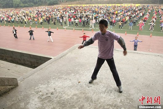 11月2日,重慶南開中學課間操上,學生們在體育老師的帶領下,在操場上興奮的跳著《最炫民族風》。前不久,全校課間操學生齊跳《江南style》的南開中學又玩起了新花樣,課間操曲子換成了《最炫民族風》。
