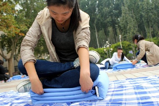 2012年10月21日,在山東聊城大學(xué)大一新生們將軍被擺放成黨徽和十八大字樣。2012年10月21日,山東聊城大學(xué)大學(xué)生們進(jìn)行疊軍被比賽。