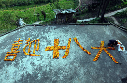 11月1日,四川省華鎣市永興鎮造甲溝村4組果農白文章,在自家院壩用收獲的蜜桔擺拼“喜迎十八大”幾個大字,迎接中共十八大的召開。