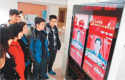 人民日?qǐng)?bào)數(shù)字新媒體在全國首次用高清雙頻直播大會(huì)實(shí)況。在上海一些政府機(jī)關(guān)、高校、社區(qū)以及上海電信營業(yè)廳,人們可以通過人民日?qǐng)?bào)電子閱報(bào)欄實(shí)時(shí)觀看十八大會(huì)議實(shí)況。圖為復(fù)旦大學(xué)的師生在校園通過“人民數(shù)字”電子閱報(bào)欄收看大會(huì)實(shí)況。(屠知力 攝)