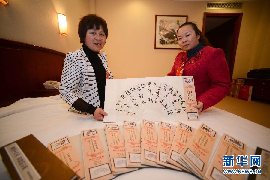 11月8日,十八大代表鄭翔(左)和時慶梅在展示《喜迎十八大 百姓的心聲》作品集。鄭翔是來自揚州一個社區的十八大代表,她帶來兩份來自基層的禮物,分別是社區群眾自發創作的《喜迎十八大百姓的心聲》詩歌書畫作品集和《幸福美如花獻禮十八大》詩歌、剪紙、攝影作品集。鄭翔表示,這兩個集子表達了社區群眾贊美美好生活和喜迎十八大的心情。(新華社記者 王建華 攝)