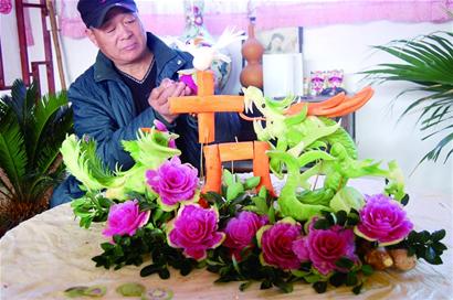 ????昨天,膠州膠東鎮大麻灣村48歲的村民崔傳寶,花了近1天時間,用上百斤蘿卜雕刻出一個 “龍鳳呈祥”,以獨特方式向黨的十八大獻禮。整個作品長約1米,高約半米,是由紅、白、青三種蘿卜以及胡蘿卜等組成,作品中間位置是由胡蘿卜拼出的“十八”字樣。(記者 牟成梓 攝)
