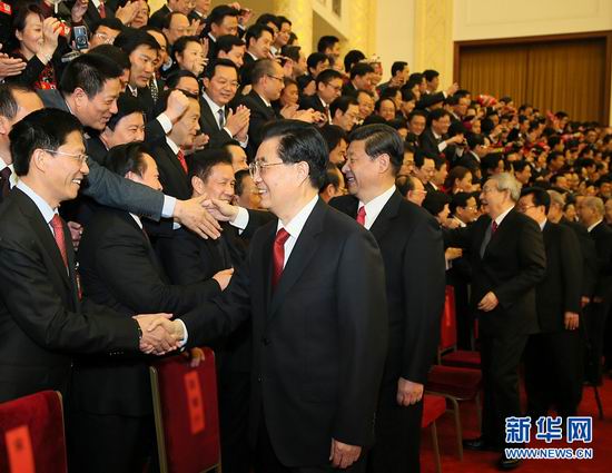 11月15日,國家主席胡錦濤,新當選的中共中央總書記、中共中央軍委主席習近平等領導同志在北京人民大會堂親切會見出席黨的十八大代表、特邀代表和列席人員并發表重要講話。新華社記者鞠鵬攝