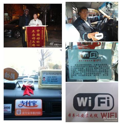 島城現(xiàn)潮的哥,自費開WiFi方便乘客。近日,交運出租的王向輝@飛翔LUT7483 師傅自費開通WiFi無線網絡,讓乘客在打車時免費無線上網。此外,王師傅還提供微博、微信約車,下一步他也將像@飛揚的紅飄帶 一樣開通支付寶手機付款。