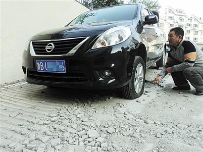 記者在現(xiàn)場(chǎng)看到,一輛黑色的豐田面包車左側(cè)兩個(gè)車輪已經(jīng)被卸下。車主氣憤地告訴記者,他已經(jīng)叫人來(lái)更換備胎,并已報(bào)警。記者注意到,小區(qū)的過(guò)道還有一輛比亞迪車右側(cè)兩個(gè)輪胎被扎破,上面各有一道約兩厘米的口子。