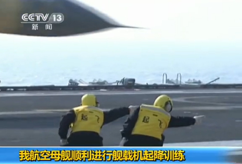 遼寧艦起飛指揮員引導艦載戰斗機起飛時的場景