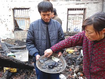 記者看到,遭遇火災的合江路3號院的一排平房共有4間,經過11月25日下午那場突如其來的大火后,4間平房早已面目全非:房頂和房門燒沒了,數十根被燒焦的木梁橫七豎八搭在墻上,四壁漆黑一片,電視機、洗衣機、冰箱等燒焦的碎片鋪了一地。一片廢墟中,清晰可見的是十幾本燒了大半的小學和初中課本,還有五六個嬰兒奶嘴。 4間平房最東戶的徐大偉和胡新莉一家、由東自西第三家的張先福一家共8口人都安全逃生,位于兩家之間的鄰居——90多歲王姓老人在火災中不幸喪生……