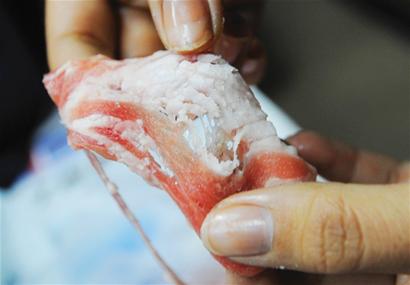 記者隨后按照網上的方法鑒別兩種價格不同的羊肉片。首先是聞味,羊肉片化凍后,32元一斤的羊肉膻味比較大,價格25元一斤的羊肉則基本沒什么膻味。聞味只是最基本的方法,這一招不能百分百準確;第二招就是手撕法,25元一斤的羊肉片紅肉與白肉顏色區分明顯,用手指輕輕一撕即可裂開。32元一斤的羊肉片白肉與紅肉相連接,紋理很清晰并且是自然的,撕開時有白肉連接,可以看到明顯的脂肪膜;最后就是看肉的紋理,兩種羊肉的紅肉部分,可以明顯的看到25元一斤的羊肉片纖維要粗于32元一斤的羊肉片。