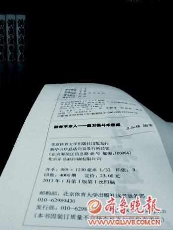 ????4日,記者來到書城,在四樓的武術類書籍里找到了這本書。記者注意到,書的內頁的確寫著首次印刷日期在2013年,印數為4000冊,定價為23元。對此,書城的工作人員解釋稱,這本書是出版社統一發的貨,絕對是正版,不會有質量問題。“可能是需要這本書的讀者太多,出版方在年底之前就出版了,這種情況很正常。”書城的工作人員稱。