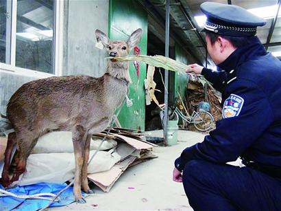 “它不停掙扎,腿上的血一直流,我們想給它包扎,根本摁不住。”民警說,后來聯系林業部門野生動物保護站的專家,通過描述,確定這是一只未成年的雌性麋鹿,年齡兩歲左右。再看麋鹿的耳朵,上面還釘著標簽,分析是養殖麋鹿,八成是在運輸路上跑了,不慎摔斷了腿。老劉家緊靠正陽西路,“跑單”的麋鹿被過往車輛嚇壞了,這才跑到老劉家躲避。