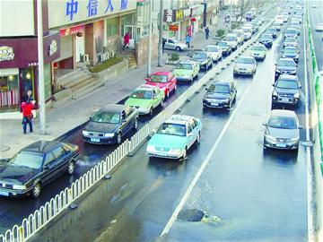 記者看到,此時氣溫比較低,馬路背陰處積水較淺的地方結起了冰凌,雖然冰凌很薄,但跟污水混在一起,路面尤為濕滑。向東行駛的車輛只能減速通過,造成上清路路口以西大面積堵車,車輛排起的長龍近兩公里,一直排到登州路。出租車司機劉先生向記者抱怨,他9時30分左右開車路過,短短1公里的路走了30多分鐘。“結冰后這車就沒法開了,關鍵是冒水的路面一直沒有人修,等到了晚上氣溫降低,這段路恐怕就要成溜冰場了。”劉先生稱,交警已經趕到現場疏導。