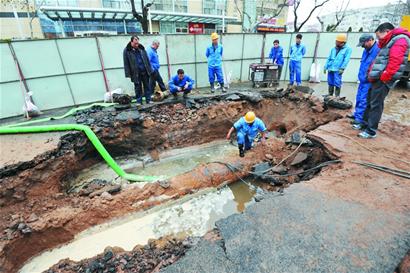 記者在爆管現場看到,延安三路的柏油路面已經被大水沖了起來,十多米的柏油面整個掀到路邊,自來水搶修工人已經挖開了一個20多平方米的大坑,坑內一根直徑600毫米的自來水供水管道正在向外冒水。工人們調來一臺大型抽水泵,將涌出的水排到不遠處的一個排水古力井當中。“我們已經關閉了周圍的閥門,現在水流不大了,漏點已經找到,馬上就要進行修復。”搶修工人告訴記者。