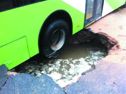 當時正在公交車上的市民周先生告訴記者,早上6時40分許,他乘坐的25路公交車沿著延安三路自南向北行駛,當時他看到道路東側有一些積水,有幾名交警已經趕到現場指揮。公交司機看到前面有兩輛私家車通過之后,也緊跟著通過,不料后輪卻突然沉了下去,司機猛踩幾腳油門也無法脫離困境,公交車反而越來越向下。司機發現事情不對,立即打開后車門讓乘客全部撤離,下車后,周先生這才發現公交車后輪已經陷在一個馬路“泉眼”里,大量的清水順著延安三路向香港路流去。隨后,交警部門調來拖車拖離公交車,不料后輪懸空無法正常拖車,附近工地的鏟車過來幫忙把公交車屁股抬起來才將公交車救出“困境”。