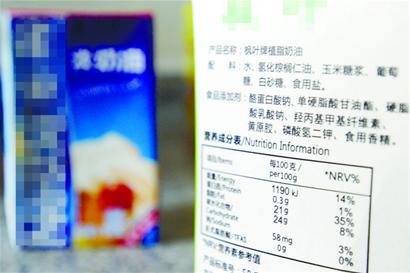 記者發現,這些商場貨架上所有品牌的咖啡伴侶都標明主要成分為“植脂末”,某知名品牌的餅干的外包裝上也標明含有氫化植物油。除了植脂末、氫化植物油之外,不少食品的成分表中標注含有“精煉植物油”、“植物奶油”等成分。換句話說,這些食品中都含有反式脂肪酸。