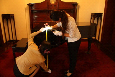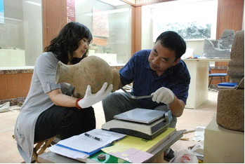 工作人員在實地測量文物