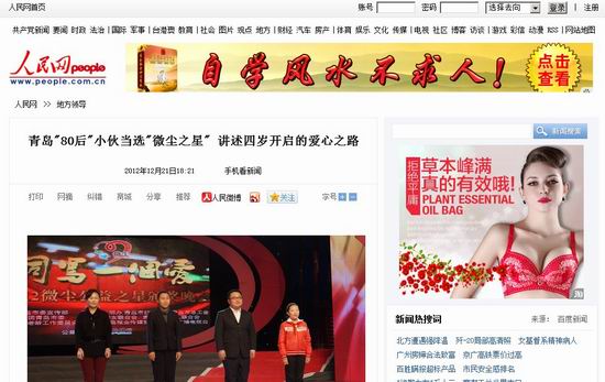 青島新聞網(wǎng)青青島社區(qū)版主“故事”的事跡,被人民網(wǎng)轉(zhuǎn)載報(bào)道。正如“最美乘務(wù)員朱麗”、“最美公交司機(jī)”、“浮山環(huán)保哥”等優(yōu)秀人物一樣,青島眾多愛心市民、愛心網(wǎng)友的事跡,不斷成為全國(guó)典型,通過中央級(jí)媒體不斷在全國(guó)范圍內(nèi)廣為傳播,為青島這座愛心之城添加了一抹又一抹亮麗的色彩。(點(diǎn)此查看人民網(wǎng)報(bào)道)