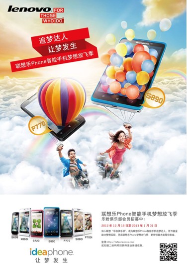 ????For Those Who Do,聯想智能手機始終鼎力支持那些心懷夢想的人。2012年12月15日起至2013年1月15日,主題為“追夢達人,讓夢發生”的聯想智能手機夢想放飛季正式起航。樂粉俱樂部會員火熱招募中,更有百萬夢想基金等你贏!