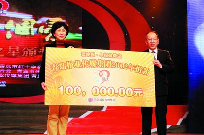 頒獎晚會進行過程中,青島報業(yè)傳媒集團現(xiàn)場將2012年義賣早報、晚報所得的10萬元善款捐給市紅十字會。