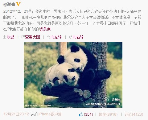 ????謝楠微博原文:“2012年12月21號(hào),傳說中的世界末日。告訴大師兄說我這天還在外地工作~大師兄果斷怒了:"那咋死一塊兒啊!"好吧,我承認(rèn)這個(gè)人不太會(huì)說情話,不太懂浪漫,不稀罕卿卿我我的肉麻,可是我就是喜歡他這樣~~這一年,連世界末日都經(jīng)歷了,還怕什么?我會(huì)好好守護(hù)你的!@吳京”