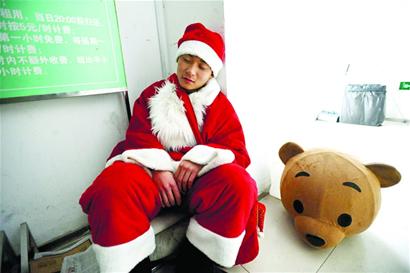 ????據介紹,目前打工的圣誕老人多數是通過網上直接找活,一些商家會在圣誕節前在網上打出招聘啟事,許多學生就會前來應征。更多的是院校的學生會成立類似社會實踐社團的組織,通過不同渠道聯系到一些勤工儉學機會,安排大學生去當圣誕老人。“忙活一個小時也就賺個一二十元,真不算多,我們就是圖個樂和。”在一家星級酒店當圣誕老人的大三學生小徐說,一個月前他和許多同學開始陸續上崗,最初一般都是晚飯前后,臨近圣誕節這幾天是全天上班,甚至晚上還要加班到八九點。“挺開心的,藏在大胡子后面裝可愛,平時很難找到這種感覺。”小徐笑著說,他覺著賺錢只是一方面,開心才是最重要的。(記者 趙健鵬)