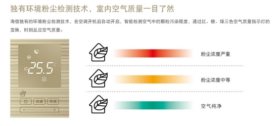 ????據悉,海信這款PM2.5空調創(chuàng)造性地采用了海信獨有的環(huán)境粉塵檢測技術,在空調開機后自動開啟,智能檢測室內空氣中的顆粒污染程度,通過紅、橙、綠三色空氣質量指示燈的變換,時刻反應空氣質量。消費者可以隨時知曉家中的空氣質量狀況,從而隨時根據需求開啟空調的凈化功能。