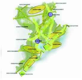 ????總規(guī)劃提出了三大生態(tài)理念,即:生態(tài)間隔理念、近自然理念、軸帶展開理念。生態(tài)間隔理念方面,以山體、海灣、河流、濕地、灘涂、林帶和各類自然保護(hù)區(qū)為生態(tài)屏障,以城市生態(tài)廊道為紐帶,將散布在城市中相對(duì)孤立的生態(tài)斑塊聯(lián)系起來。近自然理念是不搞整齊化一和過度修剪,樹種選擇要近自然,盡量使用本地樹種,形成多樣性、組團(tuán)狀的植物群落,雪松、黑松、龍柏、耐冬等暫定為城區(qū)綠化樹種的選擇,青樸、黃連木則作為落葉喬木的代表,出現(xiàn)在樹種選擇的名單之列。軸帶展開理念是以大沽河生態(tài)中軸為核心,“兩帶一網(wǎng)”為紐帶,沿主干道路、水系、農(nóng)田林網(wǎng)及其周邊區(qū)域逐步推進(jìn)各項(xiàng)生態(tài)建設(shè)工程,近期實(shí)施的大沽河治理工程、濱海公路綠化工程、萬畝林場建設(shè)工程、封山育林工程沿軸帶構(gòu)架起森林城市骨架,下一步將有重點(diǎn)、有計(jì)劃地逐步推進(jìn)各項(xiàng)工程建設(shè),最終形成點(diǎn)-線-面相結(jié)合的森林城市體系。