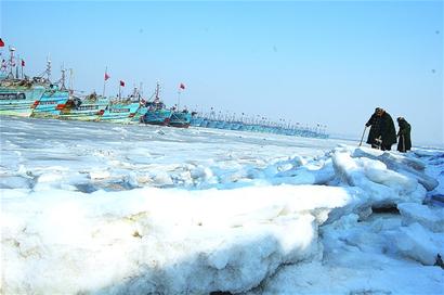 ????昨日上午,記者在膠州灣大橋附近的紅石崖碼頭附近看到,從碼頭開始一直向大海深處,肉眼能夠望到的海域全被白茫茫的海冰覆蓋。在靠近碼頭堤壩處,大塊的海冰連成片,由于前幾天下過雪,積雪層結冰后,將停靠在碼頭邊的近百艘漁船牢牢地凍住。