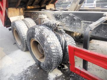 昨日上午11時許,記者接到市民報料后迅速趕到現場,在燕山路上一家酒店門前停著一輛紅色的斯太爾自卸車,右側后輪附近布滿了乳白色的干粉和黑色機油,一旁放著兩個紅色干粉滅火器。“那輛車的車輪爆了。”順著目擊者的指引記者看見,大貨右內側的后輪已經炸成兩半。