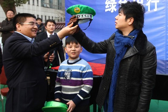 1月12日下午,頭頂綠帽、別著“好人”標牌,陳光標在江蘇南京向民眾免費發(fā)放千輛自行車。中國著名鋼琴家郎朗也來到現(xiàn)場,他彈奏了一曲鋼琴曲,稱自己在2008年也開始做公益活動,并將把500張南京演出票捐給觀眾。陳光標是大陸頗受爭議的慈善家,其“高調”行善方式長期以來惹人關注。圖為陳光標欲給郎朗戴上象征綠色出行的“綠帽子”,被郎朗婉拒絕,朗朗笑稱“拿著就行”。(泱波 攝)