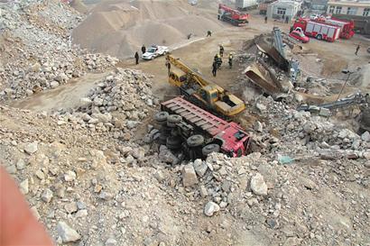 昨日下午2時10分,城陽公安分局民警和消防官兵到達了現場看到,三座沙石堆成的小山中有一個20多米深的坑,一輛紅色自卸車側翻在坑中,車頭嚴重變形,破碎的風擋玻璃散了一地,車斗和車頭連接處已經扭曲。工人稱,這輛車是卸沙土的時候從20多米高的地方后翻下來的。民警趴在地面上,透過間隙發現司機頭朝下腳朝上困在了駕駛室內,車內的方向盤座椅都已變形并死死壓在司機身上,頭部和肩膀處在不停地出血。