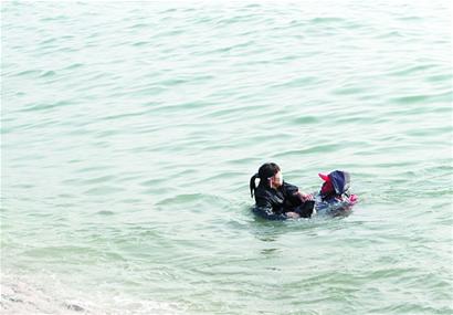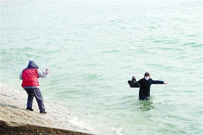 據目擊事件全過程的萬女士介紹,當時她在自己的攤位旁邊準備給別人拍照,看見一名穿著黑色呢子外套和黑色褲子,手拎黑色提包,戴著口罩的女子,穿過五四廣場海邊的欄桿,沿著斜坡徑直走向海里。“看她的樣子有些奇怪,看起來不太正常,我就大聲喊她,讓她趕緊上來。”萬女士介紹說,但這名女子不搭理她,徑直往海里走了進去。