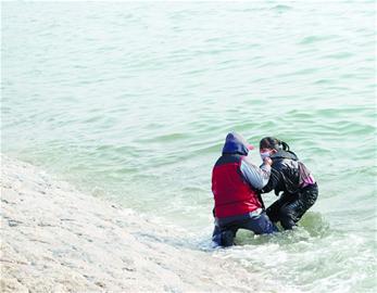 昨天下午1時左右,五四廣場海邊上演了驚險一幕,一名女子突然輕生跳海,正在一邊拉生意的攝影師付守庫來不及脫下身上厚厚的棉衣,直接跳到冰冷刺骨的海水里,將輕生女子托出水面,又在眾人的幫助下,將這名女子弄到了岸上。幸虧搶救及時,輕生女子并沒有生命危險,該女子被隨后趕到的民警帶走。記者了解到,這不是付守庫第一次救人,在五四廣場工作3年的時間里,已經救人4次。