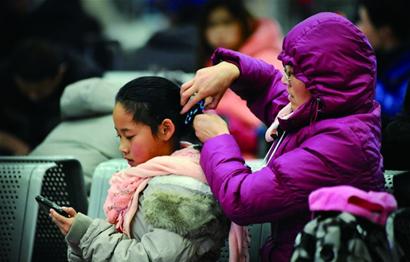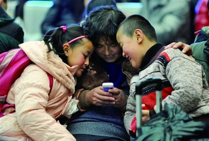 “媽,你別著急,我們正在候車廳等車呢,很快就可以檢票上車了,后天我們就能到家。”人頭攢動的候車大廳,數不清已經購買了車票的乘客或坐或站,等待檢票上車的時刻到來。在遼寧路一家電子公司工作的劉亮彤趁著檢票前的空閑,掏出手機給遠在湖南祁東的媽媽打電話。“我大學畢業后第一年在外地工作,家人不放心,幾乎天天都要打電話報平安,特別是這兩天買了車票要回家了,媽媽的電話、短信更是不斷。”劉亮彤告訴記者,他在家里是老小,父母對他特別在意,前天買到回家的火車票后,家里的電話一個接一個。劉亮彤說,他買的是站票,估計路上會很辛苦,但和家人通電話說說話,再艱苦的旅程也會很快過去。