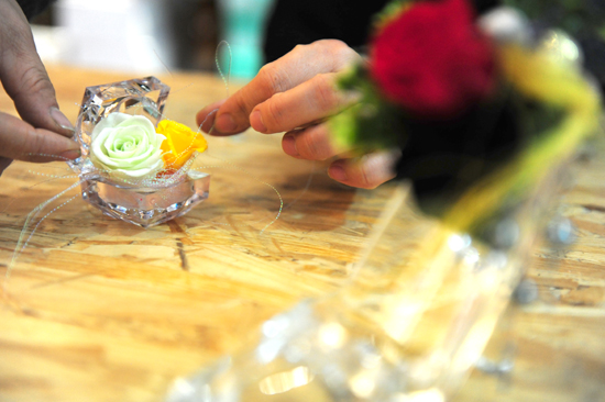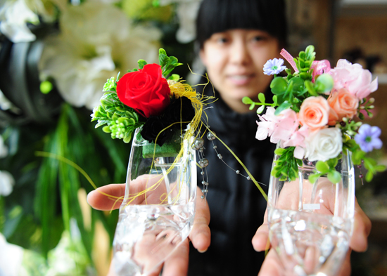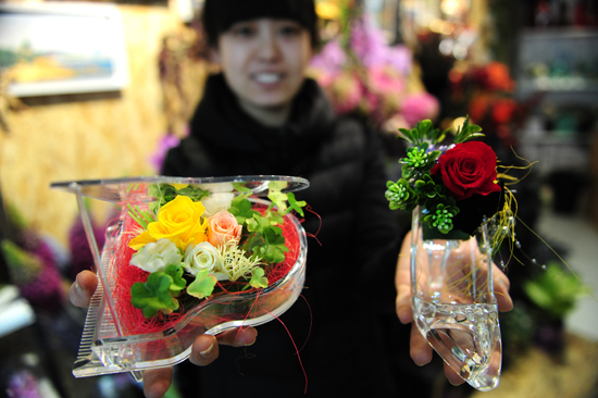 ????青島新聞網2月5日訊?? 情人節即將到來,島城花卉市場也陸續推出創意和新奇的花卉品種。記者在漳州二路和燕兒島路交匯處一家花店內看到,一種新奇的情人節干花十分熱銷,據了解,這種干花從日本引進,店主告訴記者,這種保鮮干花是今年的新品,全部從日本進口,是將玫瑰花的水分抽干以后加工而成的,因為成本較高,工藝復雜,價格也相對貴了許多。“賣相非常好,可以存放三到五年,所以十分受歡迎。”(記者 張力偉 攝)