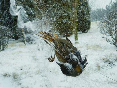 昨天,記者在黃島區深圳路與濱海大道交界處西南角的一片綠化帶里看到,竟然有人冒雪在這里支下一張20多米長、3米高的大網捕鳥。這張網的絲很細,隱蔽性強,一只斑鳩中招兒被網住,已經死去多時。記者隨后將情況反映給黃島區林業局野生動物保護站,工作人員表示將到現場處置。 (記者 趙玉勛 通訊員 韓西謙 攝)