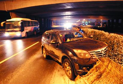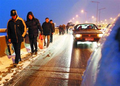 市區道路上車流量較大,降雪經車輛碾軋,大都融為雪水,雖然地面變得濕滑,但總不至于無法行車。郊區市的道路就不同了,由于車流沒有那么密集,地面降雪在融化后很快結冰,傍晚時分,隨著氣溫下降,一些道路上的雪水凝結成冰。昨天傍晚5時30分左右,一輛由機場發往市區的大巴車因為地面濕滑,在由機場通往環灣路的高架路上拋錨。 “車沒有壞,主要原因是地面結冰了,車輪抓不住地面,即便是能抓住地面,也不牢靠,在行駛中車老是甩尾。而且前面一起接一起的撞車事故,為了安全起見,大巴司機建議我們下車,我們改為步行前進。 ”市民徐先生說,他剛從外地歸來,從南寧順利回來了,但從機場回市區卻變得非常艱辛。