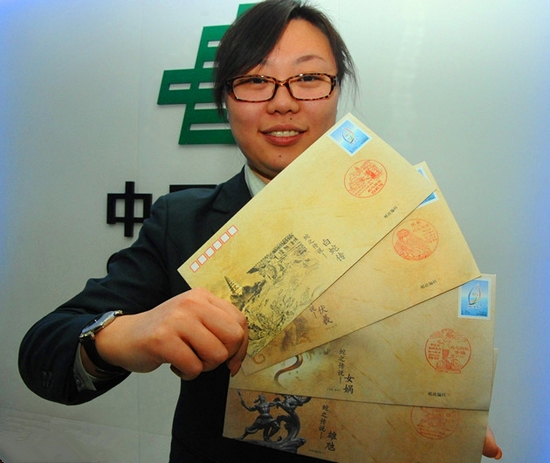 郵政工作人員展示一套4枚“蛇之傳說”主題郵資紀(jì)念封