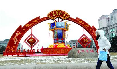 ????昨日,一名市民從五四廣場剛搭建完成的巨型拱門前走過,紅彤彤的福字拱門營造出喜慶的節日氛圍。