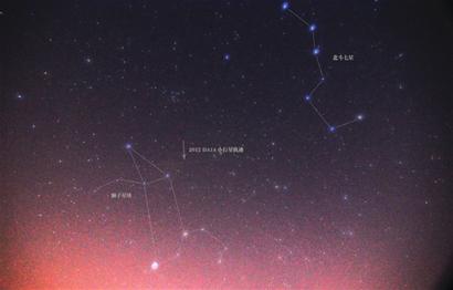 根據預報,清晨4時是小行星最亮的時候,此時它應該位于獅子星座的尾巴處,記者調試設備后開始進行一個小時的持續拍攝。因為小行星的亮度比預報的要暗很多,所以在望遠鏡中始終沒有發現它的身影,一切只能憑借對軌道的預測和相機的表現了。一個小時后,天空已經微微發亮,持續拍攝結束。查看拍攝參數,一個小時內共拍攝了376張圖片,最終在這些圖片中發現有27張有異樣——一條非常暗弱的“橫線”在數百顆星星中穿行,對比軌道,這就是掠過地球的2012DA14小行星。